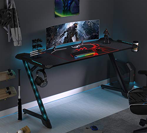 EUREKA ERGONOMIC tavolo da gioco scrivania gaming con luci LED RGB, a forma di Z Scrivania da gioco per computer, con Tappetino per il mouse, Portabicchieri (156.2 x 64.2 x 78.5 cm)