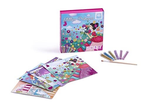 Creazione con viola colorato: questo set permette ai bambini di decorare 5 fogli di belle principesse con glitter colorati. È super facile! e il risultato, è spettacolare. Ogni pellicola ha delle zone adesive che si stanno rimuovendo progressivamente. Su ogni zona che viene rimossa, viene applicata una piccola quantità di glitter del colore desiderato e si diffonde con l'aiuto del pennello è già colorato!