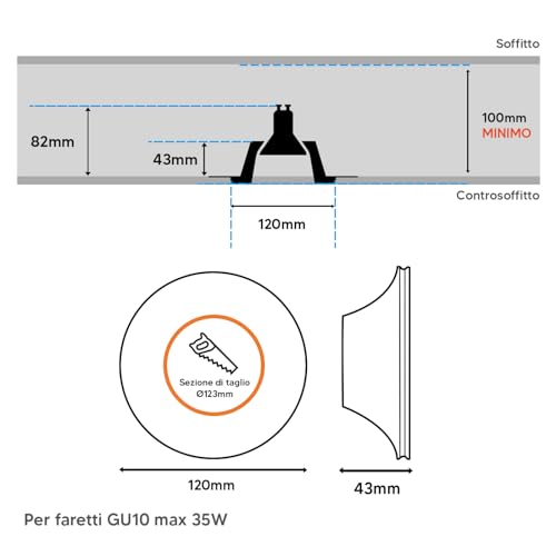 CONFEZIONE: inclusa di portalampada GU10 e molla in acciaio per fissaggio faretto.