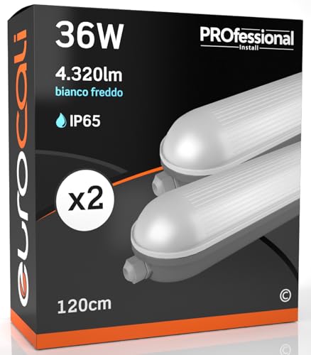Eurocali Plafoniera LED 120 cm 36W 4320 lumen Impermeabile IP65 Bianco Freddo 6500K Elevata Efficienza - Pacco da 2