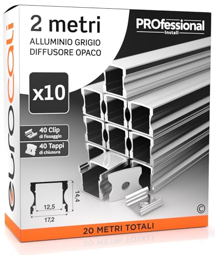 Eurocali 10x Profili da 2 metri (20mt) in Alluminio grigio per Strisce LED Copertura Opaca larghezza max striscia led 12.5mm - 17.2 x 14.4