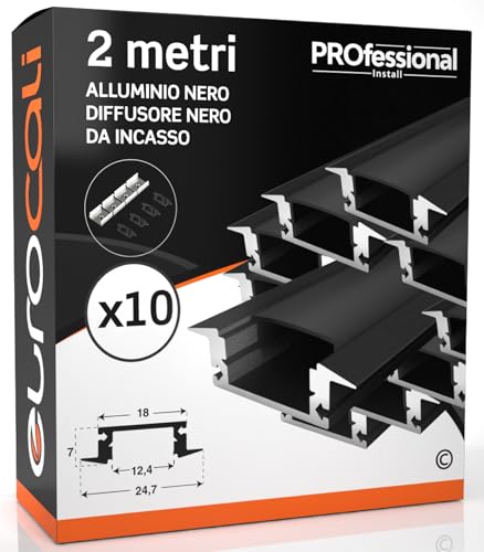 Eurocali 10x Profili da 2 metri (20mt) in Alluminio Nero per Strisce LED Copertura Opaca larghezza max striscia led 12.4 mm - 24.7 x 7