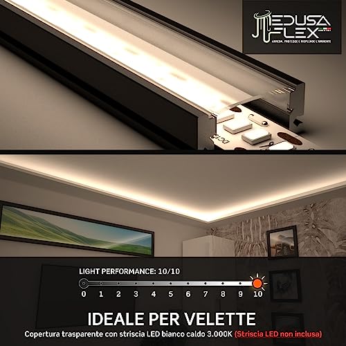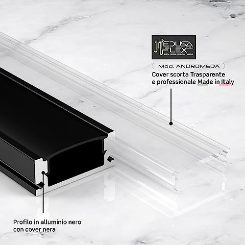 Eurocali Profilo Alluminio per Strisce LED Nero con copertura Professionale Trasparente Made in Italy MedusaFlex in Policarbonato 2000 x 17.4 x 7mm - Cover standard nera inclusa