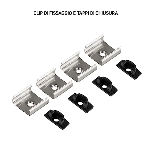 La confezione contiene un profilo in alluminio da 2 metri con copertura nera, una copertura professionale MedusaFlex Trasparente e gli accessori di fissaggio (4 tappi e 4 clip)