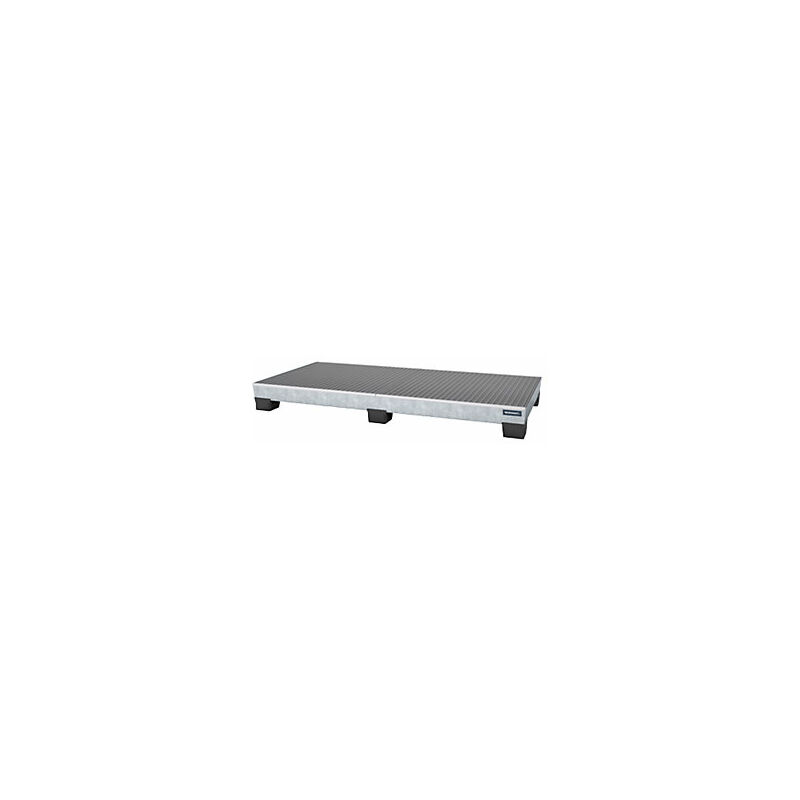 Vasca di raccolta in acciaio con piedini in plastica, lungh. x largh. x alt. 2460 x 1210 x 260 mm, zincatura a fuoco, con griglia. Fornitura = montato. Versione griglia = con griglia zincata. Capacità fusti = 8x200 l. Capacità di raccolta = 340 l. Lunghezza = 2460 mm. Larghezza = 1210 mm. Altezza = 260 mm. Capacità palette = 3 Euro o 2 sostanze chimiche. Materiale = lamiera d'acciaio. Superficie = zincatura a fuoco. Colore = zincatura a fuoco. Versione vasca di raccolta = con piedini in PP. Portata = 850 kg/m². Marchio di collaudo = ÜHP secondo la direttiva StawaR. Spessore materiale = 3 mm. Per sostanze = liquidi infiammabili e inquinanti per le acque. Classi di pericolosità = per liquidi infiammabili delle categorie GHS 1 - 3 e per liquidi inquinanti per le acque delle categorie GHS 1 - 4. Per 8 fusti da 200 litri in verticale, anche su 3 palette euronorm o su 2 palette per sostanze chimiche. Con compensazione di CO₂. Combinazione innovativa: la stabilità dell'acciaio, la resistenza
