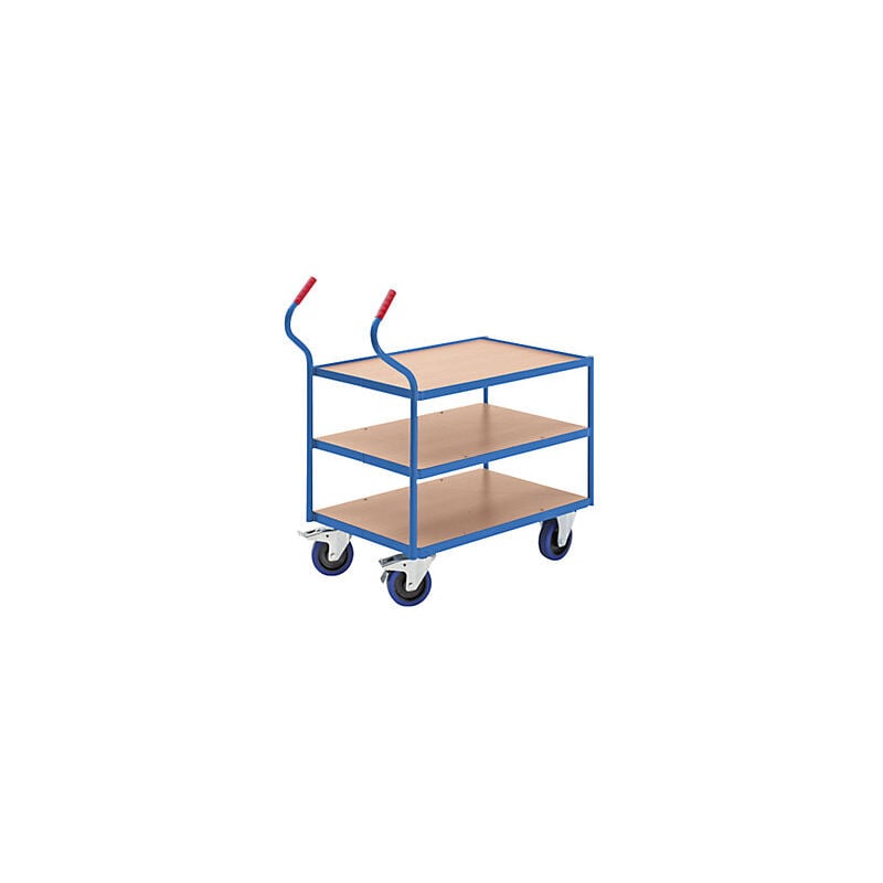 Carrello di servizio per l'industria, ruote elastiche, antitraccia, altezze ripiani 235/500/765 mm. Fornitura = montato. Numero piani = 3 pz. Lunghezza superficie di carico = 900 mm. Larghezza superficie di carico = 600 mm. Colore = blu chiaro RAL 5012, simil-faggio. Materiale superficie di carico = piano in MDF, verniciato. Portata = 400 kg. Altezza ripiani = 235 / 500 / 765 mm. Altezza = 1100 mm. Tipo di prodotto = carrelli di montaggio con 2 ripiani. Dotazione ruote = 2 rotelle a supporto fisso, 2 rotelle pivottanti con fermi. Versione ruote = gomma elastica, profilo liscio. Diametro ruote = 160 mm. Cuscinetti ruota = cuscinetto a rulli. Portata 400 kg. Facili da spostare grazie alle impugnature ergonomiche e alle rotelle pivottanti. I freni di stazionamento mantengono il carrello saldamente in posizione. Le ruote antitraccia non rovinano il pavimento e non lasciano segni. Consegnati montati e subito pronti per l'uso. Maneggevolezza e distribuzione della spinta ottimali. Ripiano