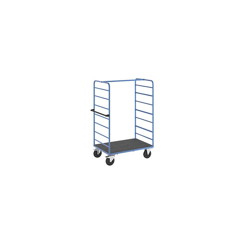 Carrello a ripiani, 2 pannelli laterali, superficie di carico 1175 x 800 mm, gomma piena. Fornitura = smontato. Portata = 500 kg. Lunghezza superficie di carico = 1175 mm. Larghezza superficie di carico = 800 mm. Lunghezza = 1350 mm. Larghezza = 800 mm. Altezza = 1792 mm. Ripiano di base = plastica riciclata. Altezza ripiani = 280 / 660 / 1030 / 1405 mm. Dotazione ruote = 2 rotelle pivottanti con fermo doppio, 2 rotelle a supporto fisso. Diametro ruote = 200 mm. Versione ruote = ruote in gomma piena. Colore telaio = blu chiaro RAL 5012. Materiale telaio = acciaio, verniciato a polvere. Piano di lavoro resistente agli agenti atmosferici, agli oli e alla maggior parte degli acidi, in plastica riciclata. I freni di stazionamento mantengono il carrello saldamente in posizione. L'impugnatura e le rotelle pivottanti permettono di spostarsi in modo flessibile verso il luogo di utilizzo. Pianale in plastica riciclata antiscivolo e antiabrasione. Ideali per il magazzinaggio temporaneo. Ideali