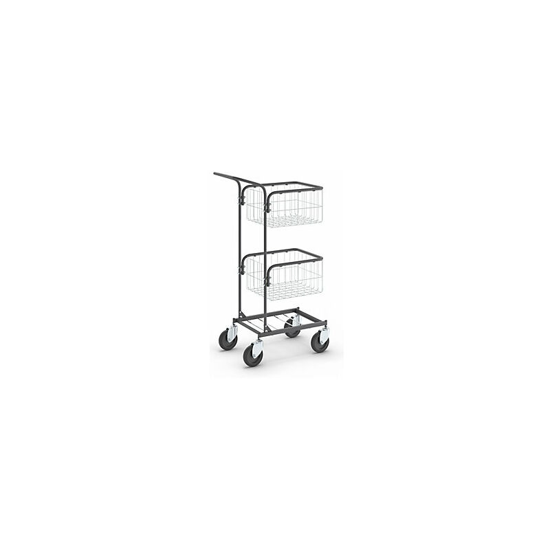 Carrello per ufficio KOMPAKT, telaio color nero notte, 4 rotelle pivottanti, Ø 125 mm. Fornitura = smontato. Lunghezza superficie di carico = 400 mm. Larghezza superficie di carico = 300 mm. Lunghezza = 630 mm. Larghezza = 360 mm. Altezza = 1090 mm. Numero ripiani = 2 pz. Portata per piano = 15 kg. Materiale telaio = tubo d'acciaio, verniciato a polvere. Colore telaio = nero notte RAL 9005. Dotazione ruote = con 4 rotelle pivottanti. Diametro ruote = 125 mm. Numero maniglioni = 1 pz. Numero piani = 2 pz. Tipo di prodotto = carrelli di smistamento documenti. Ideali per lo smistamento della posta. Ideali per mantenere l'ordine. Ideali per le operazioni di suddivisione. Dimensioni cestini: lunghezza x larghezza x altezza 400 x 300 x 210 mm. Portata cesto 15 kg. Ruote con battistrada in gomma piena antitraccia. Viene consegnato smontato. Montaggio semplice.