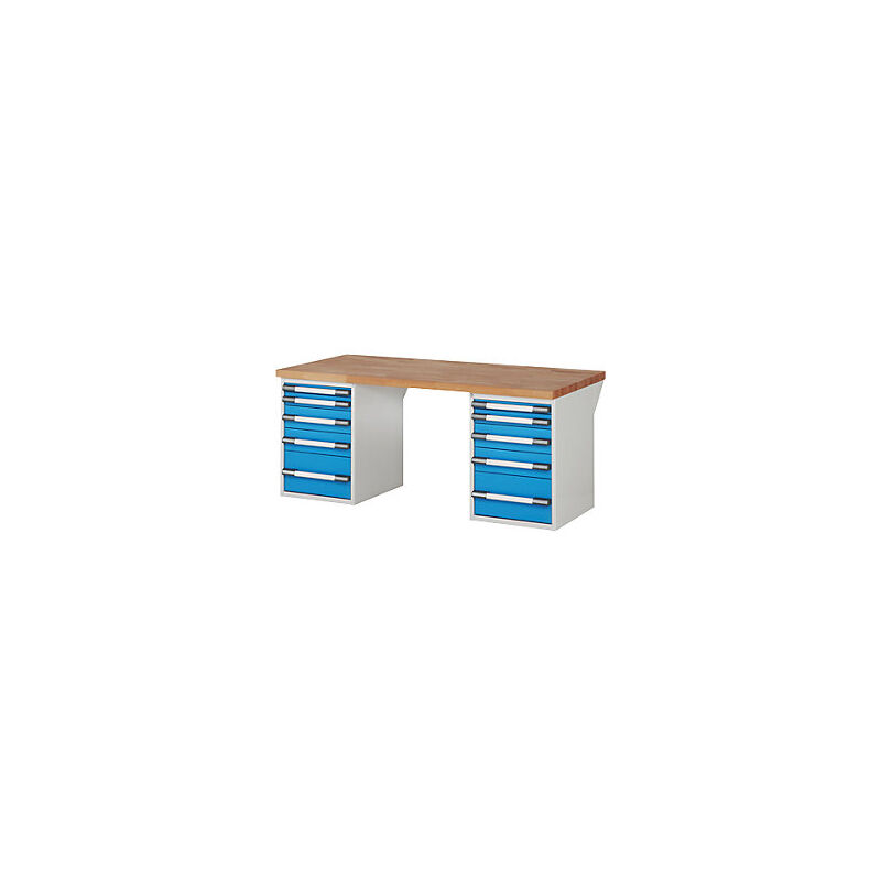Banco di lavoro, sistema modulare Serie 7000, 10 cassetti, largh. x prof. 2000 x 900 mm. Fornitura = montato. Larghezza piano = 2000 mm. Profondità piano = 900 mm. Tipo di piano = piano in faggio massello. Spessore piano = 40 mm. Numero cassetti = 10 pz. Altezza cassetti = 2x60, 2x90, 4x150, 2x270 mm. Altezza = 890 mm. Colore corpo = grigio chiaro RAL 7035. Colore frontalino = blu chiaro RAL 5012. Versione cassetti = guida a rulli. Portata per cassetto = 100 kg. Estrazione cassetti = 90%. Larghezza cassetti = 490 mm. Profondità cassetti = 560 mm. Materiale telaio = acciaio, verniciato a polvere. Portata statica = 1000 kg. Colore telaio = grigio chiaro RAL 7035. Serratura = chiusura centralizzata a cilindro. Tutti i componenti sono sempre sostituibili e ampliabili. Profondità 700 o 900 mm - per una superficie di lavoro ancora maggiore. Piano di lavoro in faggio massiccio - legno proveniente da silvicoltura sostenibile e certificata PEFC. Consegnati montati e pronti all'uso! Struttura in