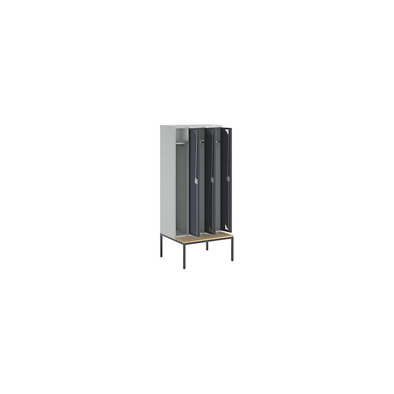 Armadio multiuso e armadio guardaroba, con panca, 3 scomparti, larghezza 900 mm, ante grigio antracite. Fornitura = montato. Altezza = 2140 mm. Larghezza = 900 mm. Profondità = 805 mm. Colore corpo = grigio chiaro RAL 7035. Colore porta = grigio antracite RAL 7016. Serratura = chiavistello girevole di sicurezza. Numero scomparti in larghezza = 3 pz. Materiale = lamiera d'acciaio, con verniciatura a forno. Larghezza scomparti = 300 mm. Profondità scomparti = 500 mm. Dotazione interna = 1 cappelliera, 1 asta appendiabiti con 3 ganci. Altezza sedile = 415 mm. Profondità sedile = 300 mm. Altezza armadio = 1750 mm. Profondità armadio = 500 mm. Tipo di porta = ante piene. Colore doghe = faggio. Colore telaio = nero. Serie = BREMEN. Larghezza interna = 298 mm. Altezza interna = 250 / 1420 mm. Con panca portante. Finecorsa di apertura integrato. Da chiusa, la serratura può essere ruotata di 360°, contro i tentativi di apertura forzata. Aerazione mediante fori sulle ante e sulla parete