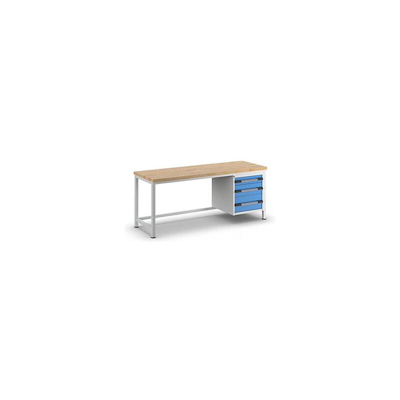 Banco da lavoro, struttura a telaio serie 8000, 3 cassetti: 1 da 120, 1 da 180, 1 da 240 mm, largh. x prof. 2000 x 700 mm. Fornitura = montato. Larghezza piano = 2000 mm. Profondità piano = 700 mm. Tipo di piano = piano in faggio massello. Spessore piano = 40 mm. Numero cassetti = 3 pz. Altezza cassetti = 1x120, 1x180, 1x240 mm. Altezza = 840 mm. Colore corpo = grigio chiaro RAL 7035. Colore frontalino = blu chiaro RAL 5012. Versione cassetti = guida a rulli. Portata per cassetto = 100 kg. Estrazione cassetti = 90%. Larghezza cassetti = 490 mm. Profondità cassetti = 560 mm. Materiale telaio = acciaio, verniciato a polvere. Portata statica = 1250 kg. Versione telaio = tubo a sezione quadra 45x45 mm. Colore telaio = grigio chiaro RAL 7035. Serratura = chiusura centralizzata a cilindro. Durevoli e stabili - ideali per l'impiego quotidiano nel settore industriale. Profondità 700 o 900 mm - per una superficie di lavoro ancora maggiore. Consegnati montati e pronti all'uso. Telaio saldato con