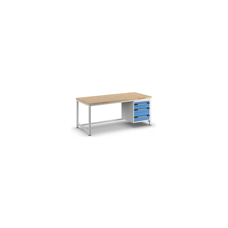 Banco da lavoro, struttura a telaio serie 8000, 3 cassetti: 1 da 120, 1 da 180, 1 da 240 mm, largh. x prof. 2000 x 900 mm. Fornitura = montato. Larghezza piano = 2000 mm. Profondità piano = 900 mm. Tipo di piano = piano in faggio massello. Spessore piano = 40 mm. Numero cassetti = 3 pz. Altezza cassetti = 1x120, 1x180, 1x240 mm. Altezza = 840 mm. Colore corpo = grigio chiaro RAL 7035. Colore frontalino = blu chiaro RAL 5012. Versione cassetti = guida a rulli. Portata per cassetto = 100 kg. Estrazione cassetti = 90%. Larghezza cassetti = 490 mm. Profondità cassetti = 560 mm. Materiale telaio = acciaio, verniciato a polvere. Portata statica = 1250 kg. Versione telaio = tubo a sezione quadra 45x45 mm. Colore telaio = grigio chiaro RAL 7035. Serratura = chiusura centralizzata a cilindro. Durevoli e stabili - ideali per l'impiego quotidiano nel settore industriale. Profondità 700 o 900 mm - per una superficie di lavoro ancora maggiore. Consegnati montati e pronti all'uso. Telaio saldato con