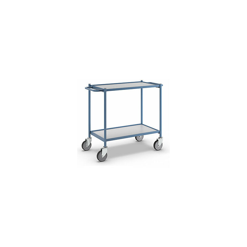 Carrello di servizio, portata 150 kg, con impugnatura, 2 ripiani, 4 rotelle pivottanti. Fornitura = smontato. Portata = 150 kg. Lunghezza superficie di carico = 745 mm. Larghezza superficie di carico = 390 mm. Lunghezza = 985 mm. Larghezza = 485 mm. Altezza ripiani = 230 / 800 mm. Materiale telaio = tubo d'acciaio, verniciato a polvere. Colore telaio = blu colomba RAL 5014. Dotazione ruote = con 4 rotelle pivottanti. Materiale ruote = gomma piena, con profilo liscio. Diametro ruote = 125 mm. Materiale superficie di carico = truciolato con verniciatura in resina melamminica. Colore superficie di carico = grigio. Numero maniglioni = 2 pz. Numero piani = 2 pz. Tipo di prodotto = carrelli di servizio per ufficio. Le impugnature su entrambi i lati consentono uno spostamento flessibile verso il luogo di utilizzo. Molto maneggevoli grazie alle 4 rotelle pivottanti. Le ruote antitraccia non rovinano il pavimento e non lasciano segni. Pratici. Versatili. Lunga durata. Robusta struttura in