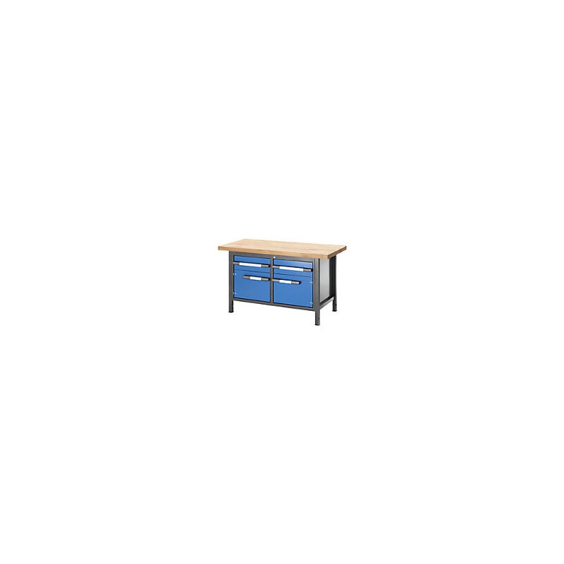 Banco da lavoro regolabile in altezza, struttura modulare, 2 cassetti, 2 ante, larghezza 1500 mm, antracite / blu. Fornitura = montato. Larghezza piano = 1500 mm. Profondità piano = 700 mm. Tipo di piano = piano in faggio massello. Spessore piano = 40 mm. Altezza cassetti = 2x180 mm. Altezza = 1040 mm. Colore frontalino = blu chiaro RAL 5012. Versione cassetti = guida telescopica su cuscinetti a sfera. Campo di regolazione altezza = 840 - 1040 mm. Portata per cassetto = 100 kg. Estrazione cassetti = 100%. Larghezza cassetti = 490 mm. Profondità cassetti = 560 mm. Materiale telaio = acciaio, verniciato a polvere. Numero ante = 2 pz. Altezza porta = 360 mm. Portata statica = 1250 kg. Versione telaio = tubo a sezione quadra 45x45 mm. Colore telaio = antracite metallizzato. Serratura = chiusura centralizzata a cilindro. Impiego: industria, officina, reparti produzione e montaggio ecc. Piano di lavoro in faggio massello non soggetto a deformazioni, spesso 40 mm. Robusta struttura in