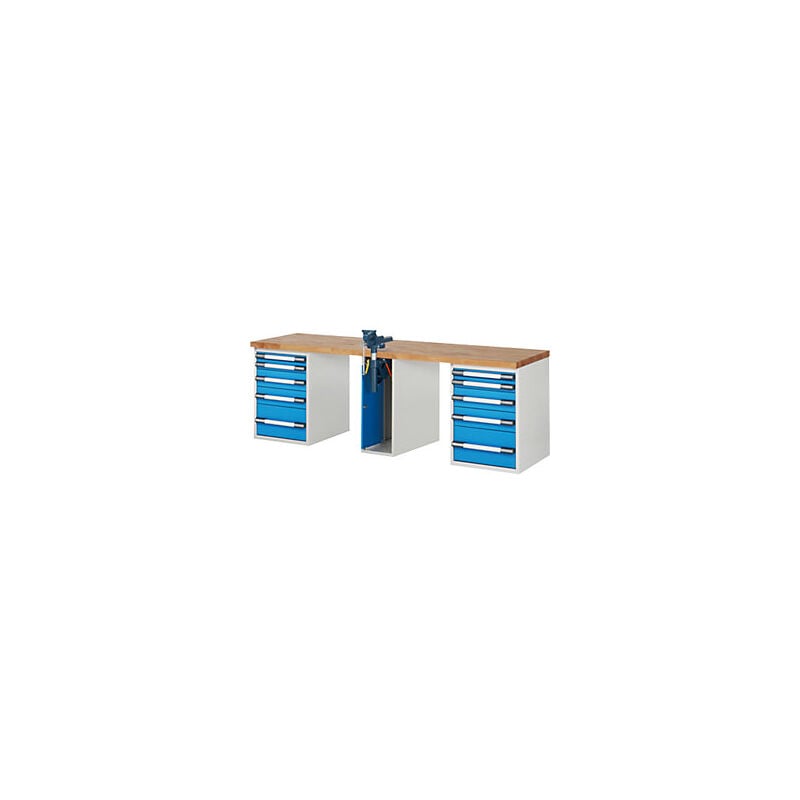 Banco di lavoro, sistema modulare Serie 7000, 10 cassetti, 1 morsa al centro, largh. x prof. 2500 x 700 mm. Fornitura = montato. Larghezza piano = 2500 mm. Profondità piano = 700 mm. Tipo di piano = piano in faggio massello. Spessore piano = 40 mm. Numero cassetti = 10 pz. Colore corpo = grigio chiaro RAL 7035. Materiale telaio = acciaio, verniciato a polvere. Colore telaio = grigio chiaro RAL 7035. Inclusa la morsa con lift ribaltabile. Tutti i componenti sono sempre sostituibili e ampliabili. Profondità 700 o 900 mm - per una superficie di lavoro ancora maggiore. Piano di lavoro in faggio massiccio - legno proveniente da silvicoltura sostenibile e certificata PEFC. Consegnati montati e pronti all'uso! Struttura in acciaio verniciata a polvere in grigio chiaro RAL 7035. Consegnati montati e pronti all'uso. Disponibili gratis: 15 colori - fino a 225 combinazioni di colori! I divisori per cassetti adatti sono disponibili online tra gli accessori. Vantaggi Qualità industriale durevole