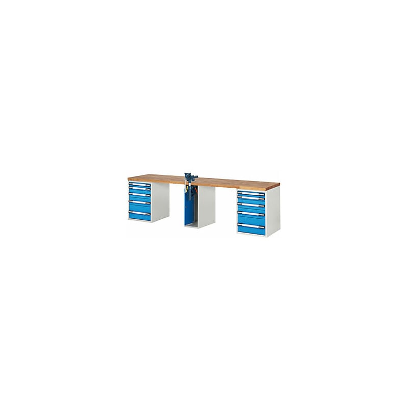 Banco di lavoro, sistema modulare Serie 7000, 10 cassetti, 1 morsa al centro, largh. x prof. 3000 x 700 mm. Fornitura = montato. Larghezza piano = 3000 mm. Profondità piano = 700 mm. Tipo di piano = piano in faggio massello. Spessore piano = 40 mm. Numero cassetti = 10 pz. Colore corpo = grigio chiaro RAL 7035. Materiale telaio = acciaio, verniciato a polvere. Colore telaio = grigio chiaro RAL 7035. Inclusa la morsa con lift ribaltabile. Tutti i componenti sono sempre sostituibili e ampliabili. Profondità 700 o 900 mm - per una superficie di lavoro ancora maggiore. Piano di lavoro in faggio massiccio - legno proveniente da silvicoltura sostenibile e certificata PEFC. Consegnati montati e pronti all'uso! Struttura in acciaio verniciata a polvere in grigio chiaro RAL 7035. Consegnati montati e pronti all'uso. Disponibili gratis: 15 colori - fino a 225 combinazioni di colori! I divisori per cassetti adatti sono disponibili online tra gli accessori. Vantaggi Qualità industriale durevole