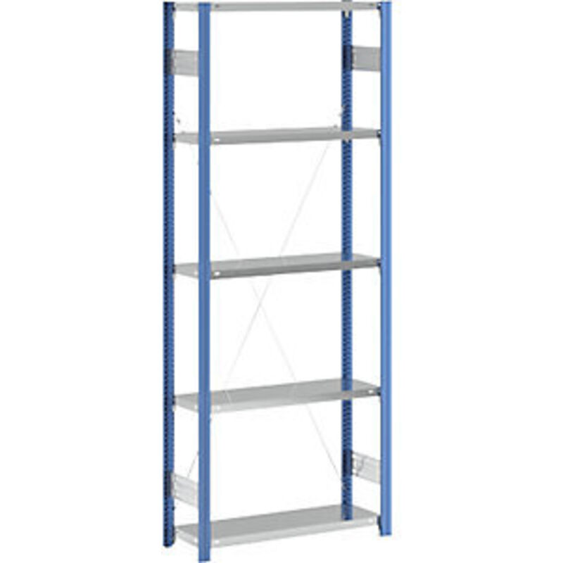 Scaffale a innesto a ripiani, blu / zincato, altezza scaffale 2350 mm, larghezza ripiano 965 mm, scaffale portante, profondità ripiano 350 mm. Fornitura = smontato. Tipo di scaffale = scaffale portante. Numero ripiani = 5 pz. Profondità ripiani = 350 mm. Portata ripiani = 150 kg. Altezza scaffale = 2350 mm. Larghezza totale = 1025 mm. Portata campata = 1000 kg. Struttura = a innesto. Colore montanti = blu chiaro RAL 5012. Larghezza ripiani = 965 mm. Profondità totale = 385 mm. Superficie = zincatura e verniciatura plastica. Passo di regolazione altezza ripiani = 25 mm. Colore ripiani = zincatura. Robusto scaffale a innesto con ripiani zincati. Facile montaggio a innesto. Possibilità di combinare elementi di base e aggiuntivi. Numero variabile di ripiani e di profondità del fondo. Configurazione in base al carico. Montaggio a pavimento incluso nella fornitura. Nel tuo magazzino, in officina e in fabbrica: affidati a questo scaffale senza bulloni estremamente stabile in acciaio con