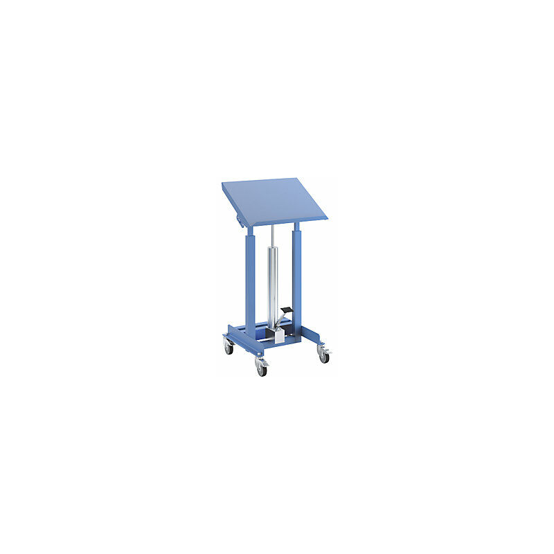 Carrello portamateriale, portata 150 kg, mobile, altezza regolabile con carico, range di regolazione altezza 720 - 1070 mm. Fornitura = montato. Portata = 150 kg. Lunghezza piattaforma = 510 mm. Larghezza piattaforma = 410 mm. Campo di regolazione altezza = 720 - 1070 mm. Angolo d'inclinazione = 0° - 40°. Regolazione dell'inclinazione = in 4 gradini, ogni gradino inclinato di 10°. Tipo di regolazione dell'altezza = senza gradini con sistema idraulico a pedale. Versione = con sistema idraulico a pedale. Materiale telaio = acciaio, verniciato a polvere. Colore telaio = blu chiaro RAL 5012. Dotazione ruote = 4 rotelle pivottanti con 4 fermi. Versione ruote = gomma piena antitraccia. Diametro ruote = 75 mm. Tipo di prodotto = carrelli portamateriale. Altezza regolabile in modo continuo con carico. Ergonomici - regolabili in altezza. Inclinabili in 4 posizioni con passo di 10° - personalizzabili in modo flessibile in base alle proprie esigenze. Girevoli e bloccabili in posizione. Molto