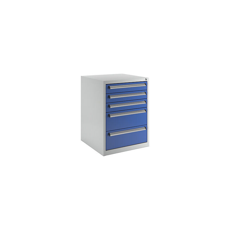 Armadietto portattrezzi, larghezza 600 mm, altezza 800 mm, cassetti 3 x 100, 2 x 200 mm. Fornitura = montato. Altezza = 800 mm. Larghezza = 600 mm. Profondità = 600 mm. Portata per cassetto = 35 kg. Numero cassetti = 5 pz. Altezza cassetti = 3x100, 2x200 mm. Estrazione cassetti = 100%. Colore corpo = grigio chiaro RAL 7035. Colore frontalino = blu genziana RAL 5010. Materiale = acciaio, verniciato a polvere. Versione cassetti = con guide telescopiche su cuscinetti a sfera. Serratura = chiusura centralizzata a cilindro. Caratteristiche = possibilità di applicare targhette. Ottimo rapporto qualità/prezzo. Cassetti su scorrevoli guide telescopiche (estraibili al 100%). Maniglie a listello in alluminio con portatarghette. Serratura a cilindro con chiusura centralizzata. Robusta struttura in acciaio verniciata a polvere. Corpo in grigio chiaro RAL 7035. Frontalini in blu genziana RAL 5010. Cassetti estraibili al 100% su scorrevoli guide telescopiche, per avere a disposizione anche gli