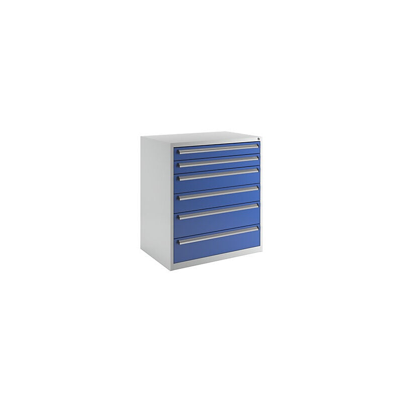Armadietto portattrezzi, larghezza 900 mm, altezza 1000 mm, cassetti 2 x 100, 2 x 150, 2 x 200 mm. Fornitura = montato. Altezza = 1000 mm. Larghezza = 900 mm. Profondità = 600 mm. Portata per cassetto = 35 kg. Numero cassetti = 6 pz. Altezza cassetti = 2x100, 2x150, 2x200 mm. Estrazione cassetti = 100%. Colore corpo = grigio chiaro RAL 7035. Colore frontalino = blu genziana RAL 5010. Materiale = acciaio, verniciato a polvere. Versione cassetti = con guide telescopiche su cuscinetti a sfera. Serratura = chiusura centralizzata a cilindro. Caratteristiche = possibilità di applicare targhette. Ottimo rapporto qualità/prezzo. Cassetti su scorrevoli guide telescopiche (estraibili al 100%). Maniglie a listello in alluminio con portatarghette. Serratura a cilindro con chiusura centralizzata. Robusta struttura in acciaio verniciata a polvere. Corpo in grigio chiaro RAL 7035. Frontalini in blu genziana RAL 5010. Cassetti estraibili al 100% su scorrevoli guide telescopiche, per avere a
