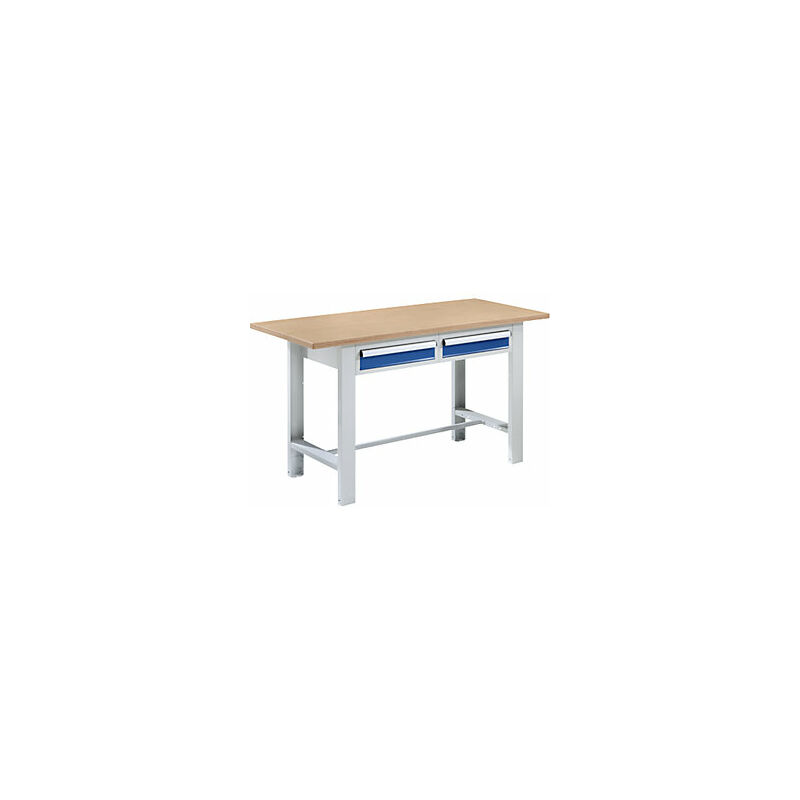 Banco da lavoro, struttura modulare, larghezza piano 1500 mm, 2 cassetti, piano in multiplex. Fornitura = smontato. Larghezza piano = 1500 mm. Profondità piano = 700 mm. Tipo di piano = piano in Multiplex. Spessore piano = 30 mm. Numero cassetti = 2 pz. Altezza cassetti = 2x100 mm. Altezza = 850 mm. Colore frontalino = blu genziana RAL 5010. Versione cassetti = guida a rulli. Campo di regolazione altezza = 850 - 900 mm. Portata per cassetto = 70 kg. Estrazione cassetti = 100%. Materiale telaio = acciaio, verniciato a polvere. Portata statica = 600 kg. Versione telaio = profilo a U 80x35 mm. Colore telaio = grigio chiaro RAL 7035. Serratura = chiusura centralizzata a cilindro. Serie professionale con molte varianti per il settore artigianale e industriale. Cassettiera molto stabile e scorrevoli guide cassetti. Piano di lavoro in multiplex spesso 30 mm - a scelta con lamiera d'acciaio zincata come protezione da olio, grasso e usura. Robusta struttura di acciaio verniciata a polvere.