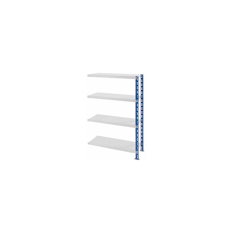 Scaffale a innesto universale, stabile, ripiani in lamiera d'acciaio, alt. x largh. x prof. 1508 x 1025 x 400 mm, scaffale aggiuntivo. Fornitura = smontato. Tipo di scaffale = scaffale aggiuntivo. Numero ripiani = 4 pz. Profondità ripiani = 400 mm. Portata ripiani = 450 kg. Altezza scaffale = 1508 mm. Larghezza totale = 1025 mm. Portata campata = 1800 kg. Struttura = a innesto. Colore montanti = blu traffico RAL 5017. Larghezza ripiani = 1000 mm. Profondità totale = 400 mm. Materiale = acciaio. Passo di regolazione altezza ripiani = 75 mm. Materiale ripiani = lamiera d'acciaio. Con ripiani in lamiera d'acciaio. Ottimo rapporto qualità prezzo. Montaggio a innesto semplice e rapido. Accurata verniciatura plastica. Ottimo sfruttamento dello spazio grazie a ripiani in tre diverse profondità e scaffali in quattro altezze. Ideali per magazzini, uffici, archivi, officine. Passo di regolazione ripiani 75 mm. I telai portanti sono dotati di piastre di base zincate (98 x 51 mm) che aumentano