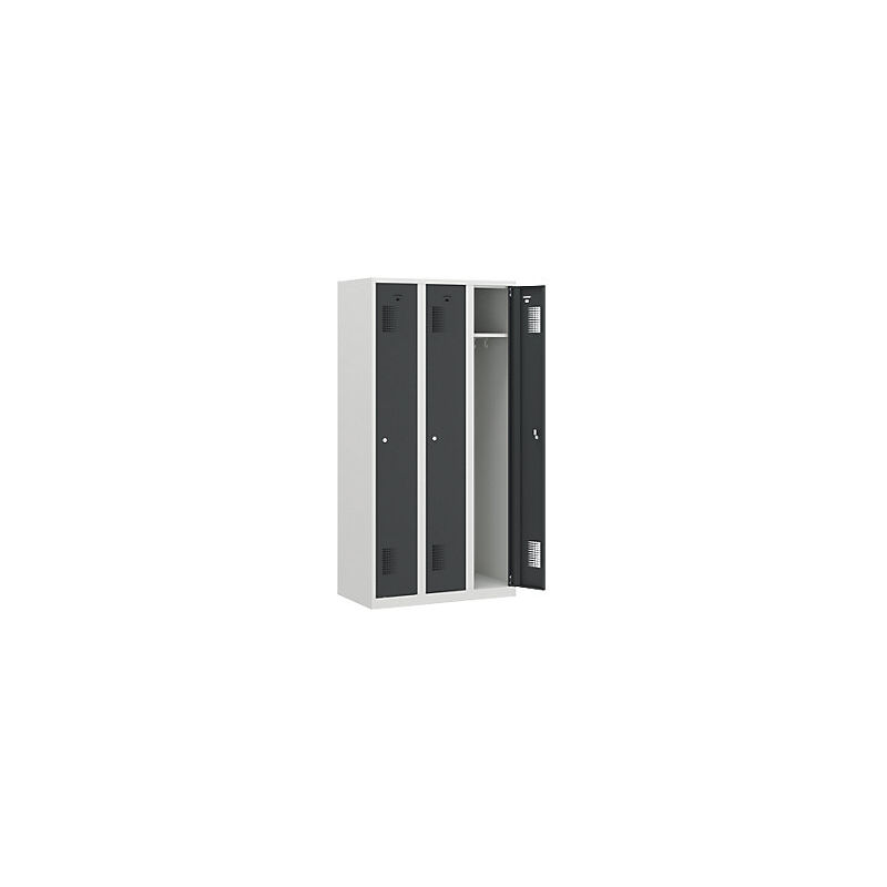Armadietto guardaroba AMSTERDAM, alt. 1800 mm, larghezza 900 mm, 3 scomparti da 298 mm, con serratura a cilindro, corpo in grigio chiaro, ante in grigio basalto. Fornitura = montato. Altezza = 1800 mm. Profondità = 500 mm. Larghezza = 900 mm. Colore corpo = grigio chiaro RAL 7035. Colore porta = grigio basalto RAL 7012. Serratura = serratura a cilindro differenziata. Numero scomparti in larghezza = 3 pz. Larghezza scomparti = 298 mm. Materiale = lamiera d'acciaio saldata. Altezza armadietto = 1800 mm. Dotazione interna = 1 cappelliera, 1 asta appendiabiti con 3 ganci. Larghezza interna = 287 mm. Altezza interna = 1730 mm. Profondità interna = 470 mm. Tipo di porta = anta a battente. Numero chiavi = 2 pz. Altezza scomparti = 1800 mm. Profondità ripiani = 500 mm. Altezza zoccolo = 60 mm. Struttura = saldata. Superficie = verniciatura a polvere. Robusto armadietto per spogliatoi a larghezza variabile. Funzionalità durevole grazie all'acciaio verniciato a polvere. Foratura per una