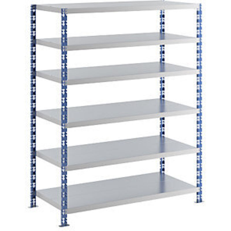 Scaffale a innesto a campata larga con ripiani in lamiera d'acciaio, profondità 700 mm, scaffale portante, alt. x largh. 1976 x 1550 mm. Fornitura = smontato. Colore montanti = blu traffico RAL 5017. Altezza scaffale = 1976 mm. Versione di scaffale = un lato utile. Tipo di scaffale = scaffale portante. Materiale = acciaio. Struttura = a innesto. Passo di regolazione altezza ripiani = 75 mm. Profondità totale = 700 mm. Larghezza totale = 1550 mm. Portata campata = 1200 kg. Portata ripiani = 200 kg. Materiale ripiani = lamiera d'acciaio. Profondità ripiani = 700 mm. Larghezza ripiani = 1500 mm. Numero ripiani = 6 pz. Luogo d'impiego = per interni. Tipo di prodotto = scaffali a innesto a campata larga. Ottimo rapporto qualità prezzo. Accurata verniciatura plastica. Ottimo sfruttamento dello spazio grazie a ripiani in cinque diverse profondità e scaffali in quattro altezze. Ideali per magazzini, uffici, archivi, officine. Passo di regolazione ripiano 75 mm. Montaggio a innesto semplice e