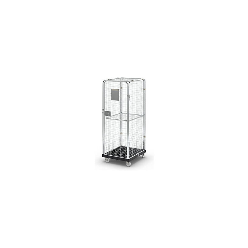 Rollcontainer con pareti in griglia, 5 lati utili, antifurto con ripiano intermedio. Fornitura = montato. Portata = 500 kg. Larghezza = 660 mm. Profondità = 815 mm. Altezza = 1810 mm. Superficie = zincatura galvanica. Dotazione ruote = 2 rotelle pivottanti, 2 rotelle a supporto fisso. Versione ruote = polipropilene. Diametro ruote = 108 mm. Cuscinetti ruota = cuscinetto a rulli. Materiale pianale con ruote = polietilene riciclato a bassa densità. Colore pianale con ruote = nero notte RAL 9005. Materiale griglia = acciaio. Altezza sponde = 1610 mm. Profondità interna = 750 mm. Altezza interna = 1585 mm. Dimensioni maglie = 50x50x4 mm. Numero ante = 1 pz. Serratura - protezione antifurto. Struttura stabile grazie al tubo tondo con Ø 22 mm. Molto spazio di stoccaggio per i prodotti. Fondo in plastica in materiale riciclato. Sponde grigliate, zincatura elettrolitica blu. Le maglie 50 x 50 mm permettono di utilizzare i ripiani intermedi (accessori) in modo variabile. Il pannello di plastica