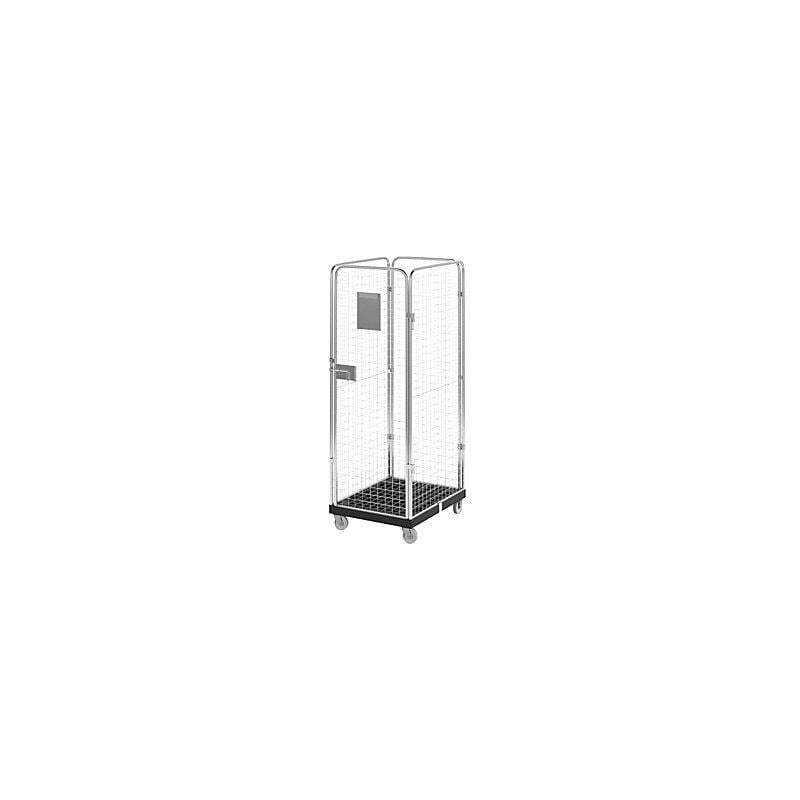 Rollcontainer con pareti in griglia, 4 lati utili, nero / zincato. Fornitura = montato. Versione rollcontainer = 4 lati utili. Portata = 500 kg. Larghezza = 660 mm. Profondità = 815 mm. Altezza = 1800 mm. Superficie = zincatura galvanica. Dotazione ruote = 2 rotelle pivottanti, 2 rotelle a supporto fisso. Versione ruote = polipropilene. Diametro ruote = 108 mm. Cuscinetti ruota = cuscinetto a rulli. Materiale pianale con ruote = polietilene riciclato a bassa densità. Colore pianale con ruote = nero notte RAL 9005. Materiale griglia = acciaio. Altezza sponde = 1610 mm. Profondità interna = 750 mm. Altezza interna = 1610 mm. Dimensioni maglie = 50x50x4 mm. Numero ante = 1 pz. Struttura stabile grazie al tubo tondo con Ø 22 mm. Molto spazio di stoccaggio per i prodotti. Fondo in plastica in materiale riciclato. Sponde grigliate, zincatura elettrolitica blu. Le maglie 50 x 50 mm permettono di utilizzare i ripiani intermedi (accessori) in modo variabile. Il pannello di plastica è realizzato