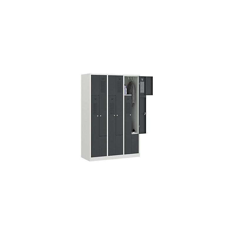 Armadietto guardaroba con ante a Z AMSTERDAM, larghezza 1185 mm, 3 scomparti, 6 ante, colore anta grigio basalto, colore corpo grigio chiaro. Fornitura = montato. Versione = foratura di aerazione sull'anta. Altezza = 1800 mm. Profondità = 500 mm. Larghezza = 1185 mm. Colore corpo = grigio chiaro RAL 7035. Colore porta = grigio basalto RAL 7012. Serratura = serratura a cilindro differenziata. Numero scomparti in larghezza = 3 pz. Numero scomparti = 6 pz. Larghezza scomparti = 198 / 395 mm. Materiale = lamiera d'acciaio. Altezza armadietto = 1800 mm. Dotazione interna = 1 asta appendiabiti, 3 ganci. Larghezza interna = 193 / 331 mm. Altezza interna = 397 / 813 / 409 mm. Profondità interna = 468 mm. Tipo di porta = anta a battente. Numero chiavi = 2 pz. Altezza scomparti = 397 / 813 / 409 mm. Larghezza ripiani = 198 mm. Profondità ripiani = 500 mm. Altezza zoccolo = 80 mm. Struttura = saldata. Superficie = verniciatura a polvere. Due armadietti guardaroba al posto di uno - più