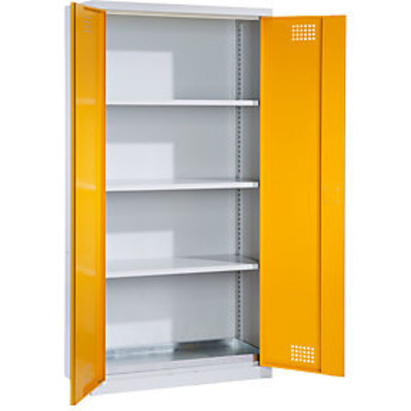 Armadio ecologico, altezza 1800 mm, 3 ripiani, 1 vasca di raccolta. Fornitura = montato. Altezza = 1800 mm. Larghezza = 920 mm. Profondità = 400 mm. Materiale = lamiera d'acciaio. Colore corpo = grigio chiaro RAL 7035. Colore porta = giallo melone RAL 1028. Numero ante = 2 pz. Tipo di porta = anta a battente. Portata per ripiano = 40 kg. Numero ripiani = 3 pz. Numero piani d'appoggio = 4 pz. Materiale per ripiani = lamiera d'acciaio, zincata. Serratura = serratura a cilindro. Superficie = verniciatura a polvere. Passo di regolazione altezza ripiani a vasca = 25 mm. Per il magazzinaggio sicuro in taniche di liquidi inquinanti per le acque. Ripiani a vasca e vasche di raccolta a tenuta stagna (senza omologazione ÜHP). Ante con serratura. Aperture nelle ante per un'efficace ventilazione. Ripiani o ripiani a vasca regolabili in altezza. L'armadio ecologico eurokraft basic convince per la funzionalità, la robustezza e il rapporto qualità-prezzo. È adatto per lo stoccaggio sicuro in ambienti