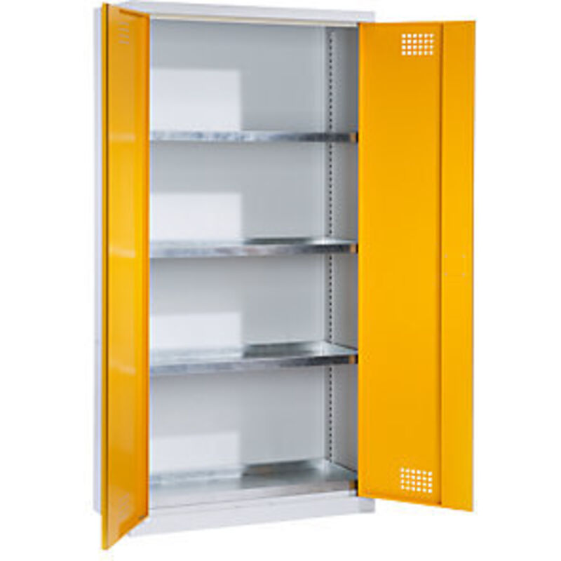 Armadio ecologico, altezza 1800 mm, 3 ripiani, 1 vasca di raccolta. Fornitura = montato. Altezza = 1800 mm. Larghezza = 920 mm. Profondità = 400 mm. Materiale = lamiera d'acciaio. Colore corpo = grigio chiaro RAL 7035. Colore porta = giallo melone RAL 1028. Numero ante = 2 pz. Tipo di porta = anta a battente. Portata per ripiano = 40 kg. Numero piani d'appoggio = 4 pz. Materiale per ripiani = lamiera d'acciaio, zincata. Serratura = serratura a cilindro. Superficie = verniciatura a polvere. Numero di ripiani a vasca = 3 pz. Passo di regolazione altezza ripiani a vasca = 25 mm. Per il magazzinaggio sicuro in taniche di liquidi inquinanti per le acque. Ripiani a vasca e vasche di raccolta a tenuta stagna (senza omologazione ÜHP). Ante con serratura. Aperture nelle ante per un'efficace ventilazione. Ripiani o ripiani a vasca regolabili in altezza. L'armadio ecologico eurokraft basic convince per la funzionalità, la robustezza e il rapporto qualità-prezzo. È adatto per lo stoccaggio sicuro