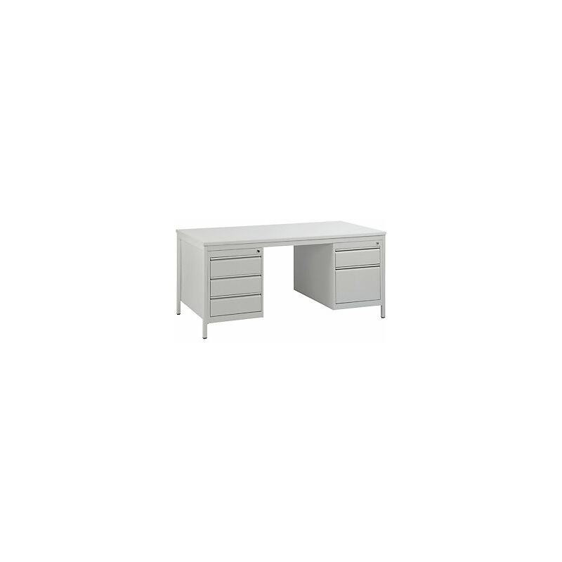 Scrivania per capi reparto, grigio chiaro, cassetti 4 x 140 mm, 1 x 280 mm, largh. x prof. 1600 x 800 mm. Fornitura = smontato. Larghezza = 1600 mm. Profondità = 800 mm. Altezza cassetti = 3x140, 1x140, 1x280 mm. Numero cassetti = 5 pz. Materiale telaio = acciaio, verniciato a polvere. Colore telaio = grigio chiaro RAL 7035. Altezza di lavoro = 755 mm. Spessore piano = 25 mm. Larghezza cassetti = 460 mm. Profondità cassetti = 570 mm. Tipo di piano = truciolato con verniciatura plastica. Colore piano = grigio chiaro. Tipo di prodotto = scrivanie per capi reparto. Tavolo universale conveniente per uffici, azienda, magazzini e reparti spedizioni. A scelta con funzionali armadietti sottopiano. Piano di lavoro plastificato spesso 25 mm, grigio chiaro. Robusto telaio in tubi a sezione quadrata, verniciato a polvere in grigio chiaro RAL 7035. Altezza di lavoro 755 mm. Cassetti estraibili con scorrimento agevole. Larghezza x profondità cassetti 460 x 570 mm. Profondità complessiva 780 mm.