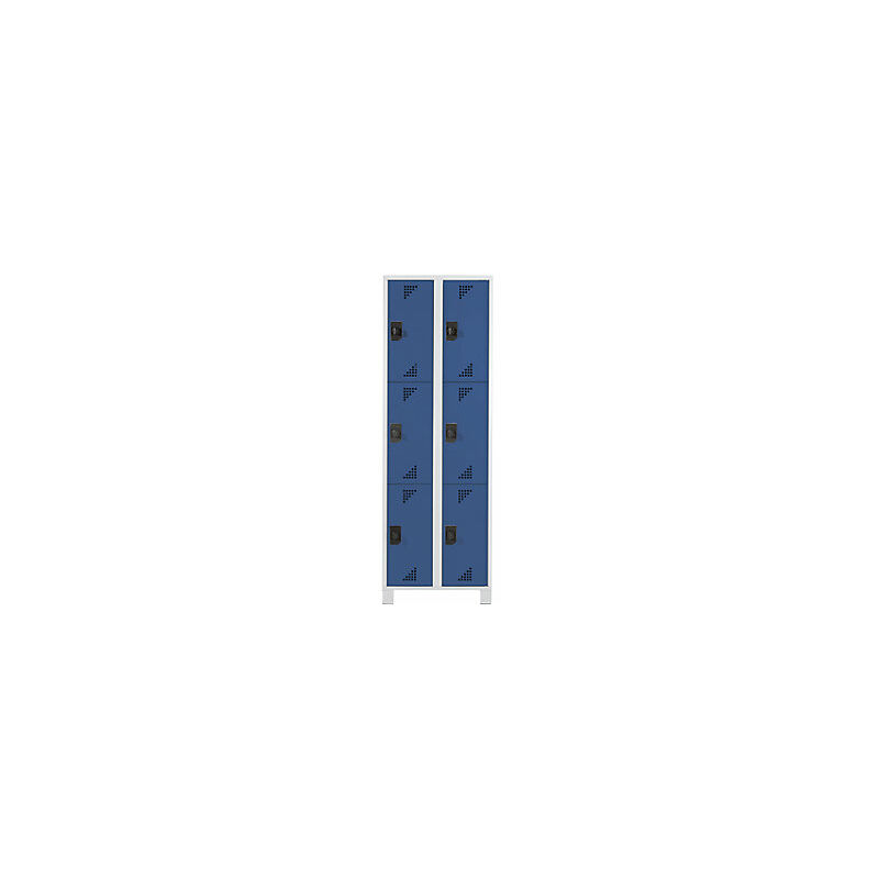 Armadietto a scomparti, altezza scomparto 558 mm, alt. x largh. x prof. 1800 x 800 x 500 mm, 6 scomparti, corpo in grigio chiaro, ante in blu brillante. Fornitura = montato. Altezza = 1800 mm. Profondità = 500 mm. Larghezza = 800 mm. Colore corpo = grigio chiaro RAL 7035. Colore porta = blu brillante RAL 5007. Serratura = chiavistello girevole di sicurezza per lucchetto. Numero scomparti in larghezza = 6 pz. Larghezza scomparti = 400 mm. Materiale = lamiera d'acciaio, saldata a punti. Altezza armadietto = 558 mm. Dotazione interna = senza accessori. Tipo di porta = anta a battente. Struttura = saldata a punti. Superficie = con verniciatura a forno. Finecorsa di apertura integrato. Da chiusa, la serratura può essere ruotata di 360°, contro i tentativi di apertura forzata. Piedini zincati, regolabili in altezza fino a 10 mm. Aerazione mediante fori sulle ante e sulla parete posteriore. Robusta struttura in lamiera d'acciaio saldata a punti, verniciatura a fuoco. Corpo sempre in grigio