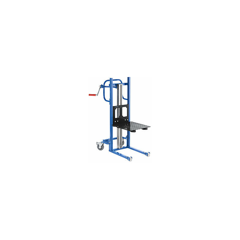 Carrello elevatore per materiali, con piattaforma, con rulli forche. Fornitura = in parte smontato. Versione = piattaforma / rotelle a supporto fisso. Elemento di attacco lungh. x largh./Ø = 600x430 mm. Portata = 120 kg. Baricentro del carico = 300 mm. Range di sollevamento = 80 - 945 mm. Larghezza di carico = 430 mm. Lunghezza totale = 970 mm. Larghezza totale = 506 mm. Altezza totale = 1265 mm. Altezza entrate forche = 75 mm. Materiale = acciaio. Caratteristiche = manuale. Superficie = verniciatura a polvere. Colore = blu segnaletico RAL 5005. Sollevamento carico intercambiabile. A scelta con rotelle a supporto fisso oppure a guida quadridirezionale. Ruote sterzanti con fermi. Carrello elevatore per materiali con differenti strumenti di sollevamento carichi per diversi impieghi. Baricentro del carico 300 mm. Per portare materiali o attrezzi da lavoro all'altezza ideale. Spostabile su 2 rotelle pivottanti con fermi e 2 rulli forche o con guida quadridirezionale. Sollevamento tramite
