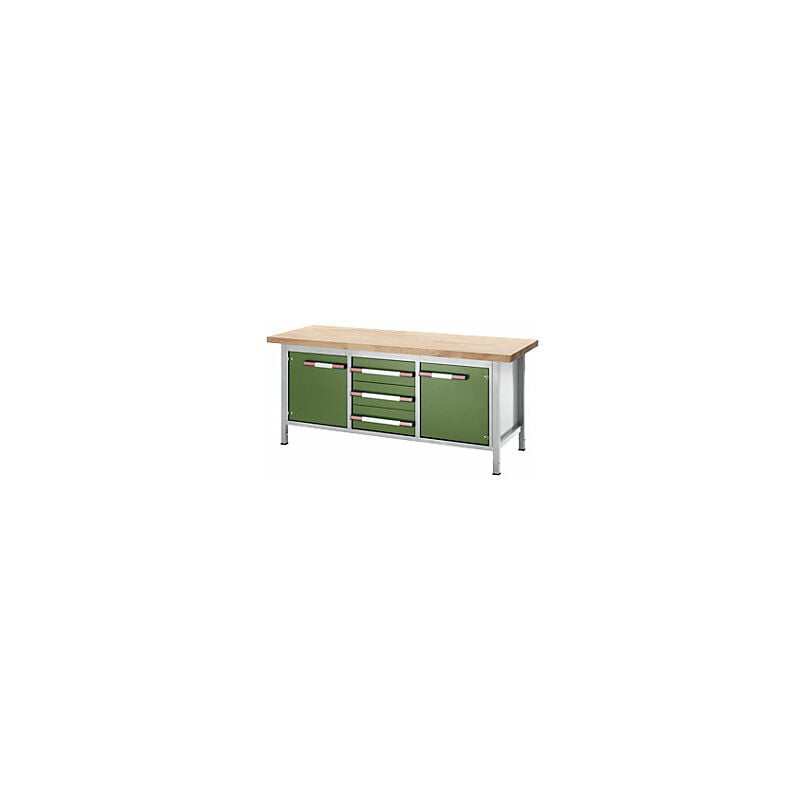 Banco da lavoro regolabile in altezza, struttura modulare, 3 cassetti, 2 ante a battente, larghezza 2000 mm, grigio chiaro / verde. Fornitura = montato. Larghezza piano = 2000 mm. Profondità piano = 700 mm. Tipo di piano = piano in faggio massello. Spessore piano = 40 mm. Altezza cassetti = 3x180 mm. Altezza = 1040 mm. Colore frontalino = verde reseda RAL 6011. Versione cassetti = guida telescopica su cuscinetti a sfera. Campo di regolazione altezza = 840 - 1040 mm. Portata per cassetto = 100 kg. Estrazione cassetti = 100%. Larghezza cassetti = 490 mm. Profondità cassetti = 560 mm. Materiale telaio = acciaio, verniciato a polvere. Numero ante = 2 pz. Altezza porta = 540 mm. Portata statica = 1250 kg. Versione telaio = tubo a sezione quadra 45x45 mm. Colore telaio = grigio chiaro RAL 7035. Serratura = chiusura centralizzata a cilindro. Impiego: industria, officina, reparti produzione e montaggio ecc. Piano di lavoro in faggio massello non soggetto a deformazioni, spesso 40 mm. Robusta