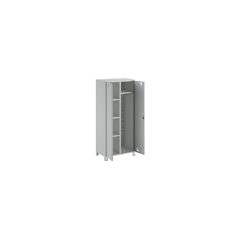 Armadio multiuso e armadio guardaroba, con asta appendiabiti, 6 scomparti, larghezza 800 mm, completamente in grigio chiaro. Fornitura = montato. Altezza = 1800 mm. Profondità = 500 mm. Larghezza = 800 mm. Colore corpo = grigio chiaro RAL 7035. Colore porta = grigio chiaro RAL 7035. Serratura = chiavistello girevole di sicurezza per lucchetto. Numero scomparti in larghezza = 2 pz. Numero scomparti = 6 pz. Larghezza scomparti = 400 mm. Materiale = lamiera d'acciaio, saldata a punti. Altezza armadietto = 1695 mm. Dotazione interna = 3 ripiani a sinistra, cappelliera, asta appendiabiti a destra. Tipo di porta = anta a battente. Altezza scomparti = 4x420 / 1x290 / 1x1400 mm. Larghezza ripiani = 400 mm. Struttura = saldata a punti. Superficie = con verniciatura a forno. Con chiavistello girevole di sicurezza: da chiusa, la serratura può essere ruotata di 360°, contro i tentativi di apertura forzata. Finecorsa di apertura a 100° integrato. Aerazione mediante fori sulle ante e sulla parete
