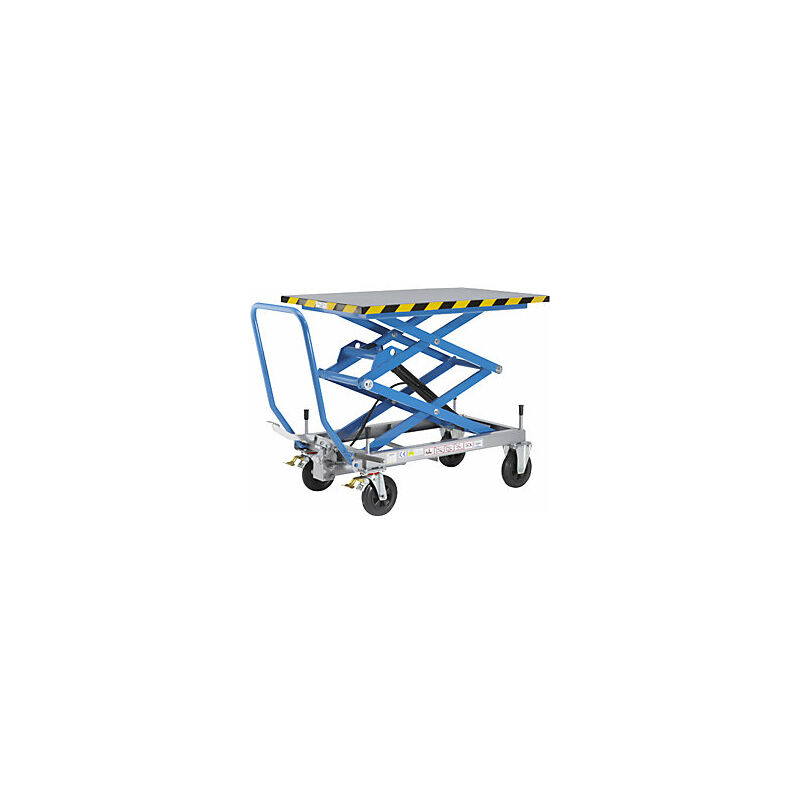 Piano di sollevamento a pantografo doppio, portata 500 kg, campo di sollevamento 510 - 1800 mm, ruote in gomma piena. Fornitura = montato. Portata = 500 kg. Range di sollevamento = 510 - 1800 mm. Lunghezza totale = 1435 mm. Larghezza totale = 740 mm. Superficie piattaforma = zincatura. Versione impugnatura = fissato a vite. Superficie impugnatura = verniciatura a polvere. Colore impugnatura = blu chiaro RAL 5012. Sollevamento per colpo di pedale = 20 mm. Sistema di sollevamento = idraulico a pedale. Tipo di prodotto = carrelli di sollevamento a piattaforma. Dotazione ruote = 2 ruote sterzanti con fermo doppio, 2 rotelle a supporto fisso. Materiale ruote = gomma piena. Diametro ruote = 200 mm. Prodotti di qualità - Made in Germany. Piattaforma zincata, inossidabile. Pantografo e impugnatura verniciati a polvere in blu chiaro RAL 5012, sottotelaio in alluminio brillante RAL 9006. 2 rotelle pivottanti con fermo doppio e 2 rotelle a supporto fisso, cuscinetti a rulli. Cilindro di