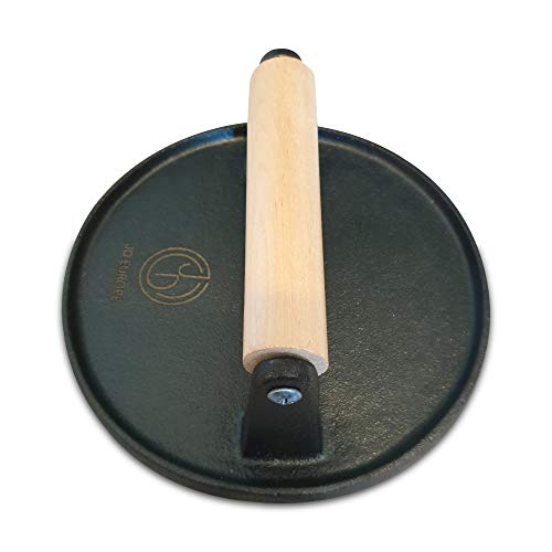 Questo è uno strumento indispensabile per tutti, sia che tu sia un cuoco serio o un nuovo per grigliare. La ghisa irradia il calore in modo uniforme, aiutando gli alimenti a cucinare alla perfezione. Cucinare il grasso mentre la carne brucia sviluppa sapori complessi. Trattare la pressa come tutte le pentole in ghisa, durante il lavaggio a mano, assicurarsi di asciugarla immediatamente per evitare la ruggine o rovinare il condimento Strofinare uno strato molto leggero di olio da cucina sulla superficie della pressa. Utilizzare un tovagliolo di carta per pulire la superficie fino a quando non rimane residui di olio.