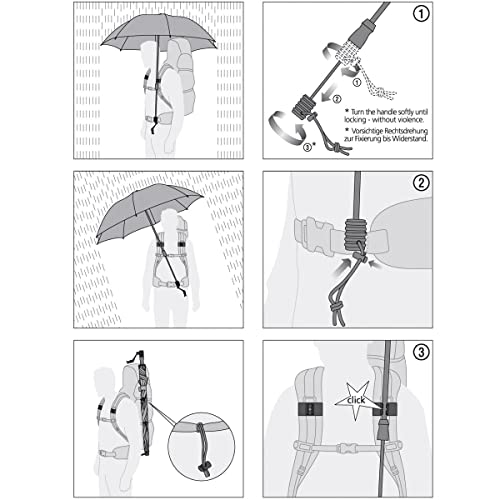 L' ombrellone può essere rimossa in qualsiasi zaino più comuni con cintura semplice da fissare e allineare varia in base alla direzione del vento. Alternativa il schermo può anche a un sistema speciale cinghia Fattore di Euro schermo (non incluse) essere montato