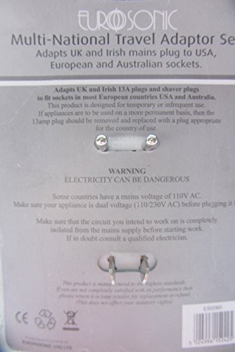 Eurosonic - Set di spine adattatrici (3-pin su 2-pin), per Nord America, America Centrale e Sud America, Asia, Australia, Europa (Albania, Algeria, Angola, Argentina, Austria, Azzorre, Bangladesh, Belgio, Bolivia, Bosnia, Brasile, Bulgaria, Burkina Faso, Burundi, Camerun, Isole Canarie, Capo Verde, Isole del Canale, Cile, Cina, Comore, Congo, Croazia, Cipro, Danimarca, Gibuti, Egitto, Eritrea, Finlandia, Francia, Gabon, Germania, Gibilterra, Grecia, Groenlandia, Guadalupa, Guinea, Ungheria, Islanda, India, Indonesia, Iran, Iraq, Isola di Man, Israele, Italia, Kazakistan, Corea, Kuwait, Laos, Libano, Lituania, Lussemburgo, Macedonia, Madagascar, Madeira, Mali, Martinica, Mauritania, Mauritius, Monaco, Marocco, Mozambico, Nepal, Olanda, Nigeria, Norvegia, Pakistan, Paraguay, Peru, Filippine, Polonia, Portogallo, Romania, Russia, Ruanda, Senegal, Somalia, Spagna, Sudan, Suriname, Svezia, Siria, Tailandia, Togo, Tunisia, Turchia, Uruguay, Vietnam, ex Jugoslavia, Zambia), 2 pezzi