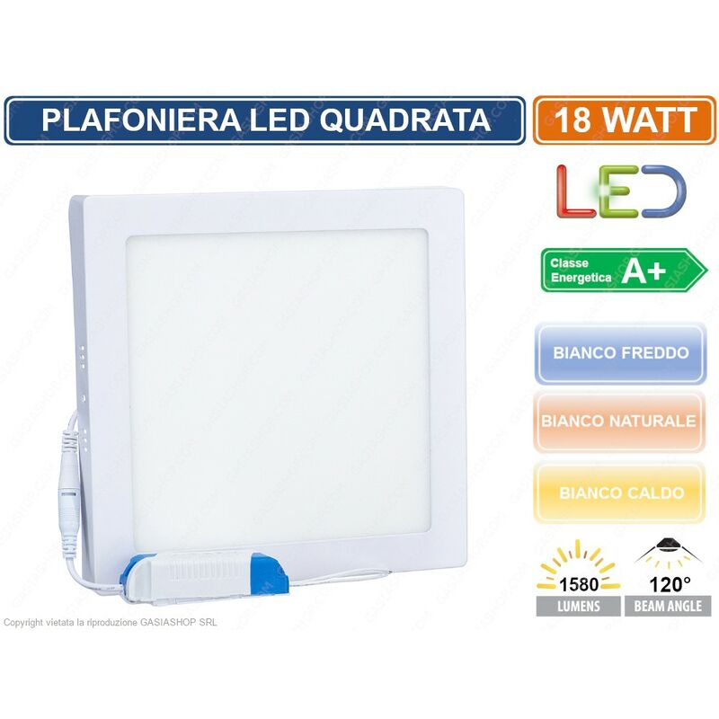 Plafoniera LED con potenza di 18W. Questo pannello di forma quadrata, è realizzato in alluminio. LED SMD con fascio luminoso di 120°, flusso luminoso di 1580 lm e rapporto di 88 lm/W. Incluso driver . Nella confezione sono comprese anche 1 piastra di fissaggio con le viti. Adatto ad essere sostituito in uffici, showroom e sale conferenze. Questo modello di pannello LED da soffitto è disponibile con 3 diverse temperature colore: Luce Bianca Calda 3000K (PLAF-SQ-22W/C, Bianca Naturale 4000K (PLAF-SQ-22W/N) e Bianca Fredda 6500K (PLAF-SQ-22W/F). Dimensioni: 225 x 225 x 32 mm. INSTALLAZIONE