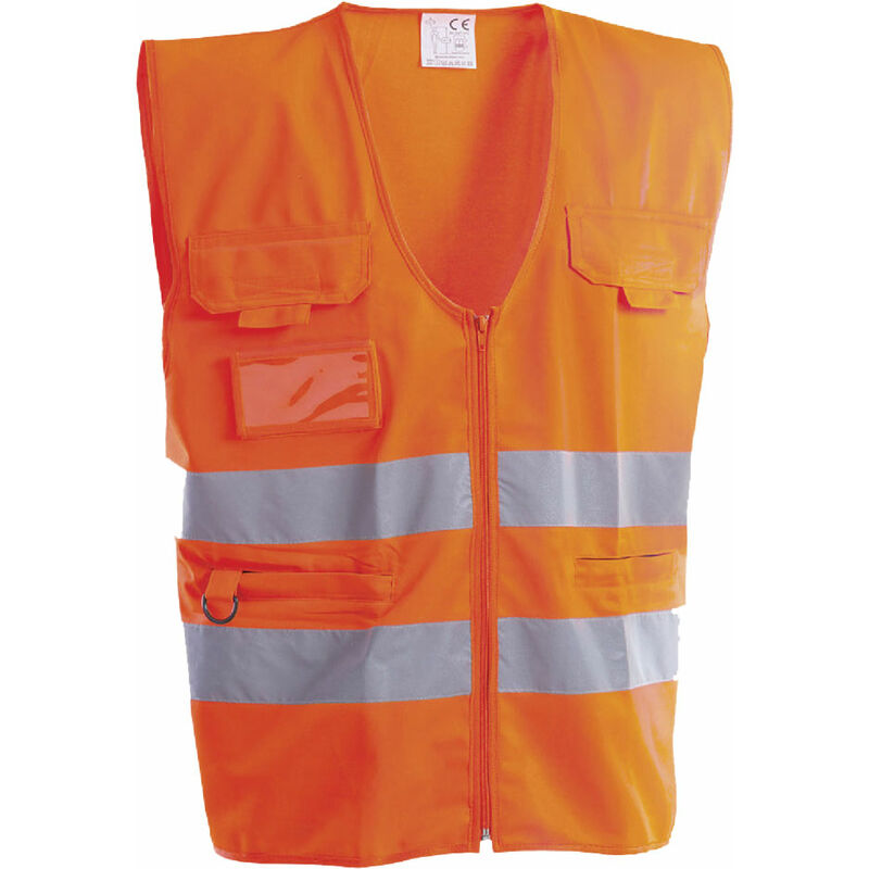Colore arancio. Tessuto 100% poliestere. Chiusura centrale con cerniera, portabadge staccabile al petto, 2 tasche al petto chiuse con pattina e velcro, 2 tasche inferiori chiuse con cerniera, anello portachiavi sulla tasca inferiore destra. A norma UNI EN 20471:2013 classe 2. Peso 120 gr/mq. 80166128
