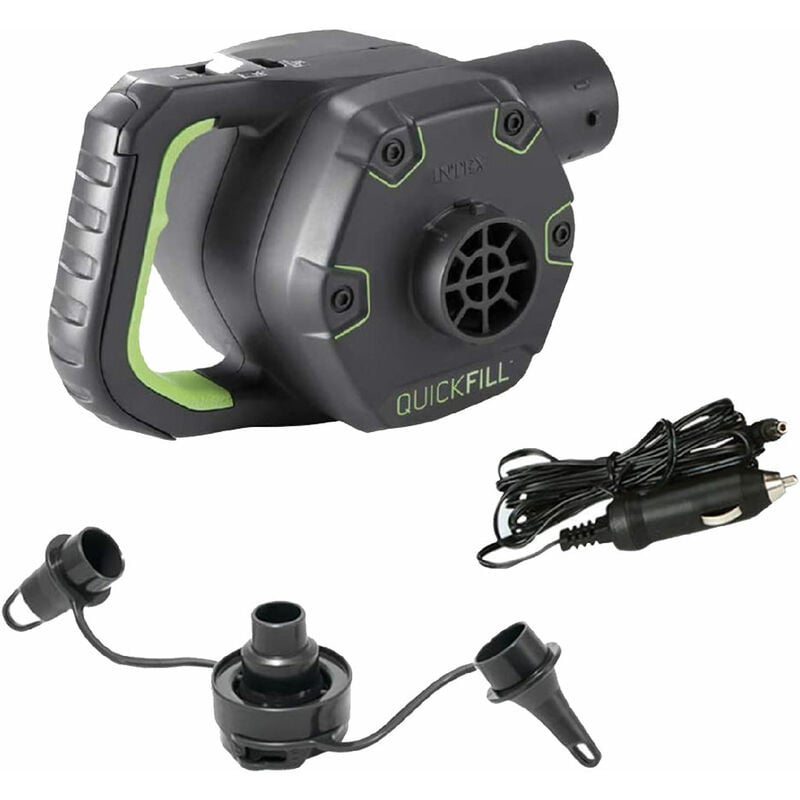 Con tre valvole. Adatta per il gonfiaggio di prodotti per il mare e per il giardino. La batteria è ricaricabile ed è di semplice utilizzo. Possibilità di ricarica tramite accendisigari o prese di rete: sia con alimentatore DC 12V che 220V-240V. Praticità e semplicità d'uso grazie all'ergonomia della maniglia e grazie alla sua leggerezza. Meccanismo di sicurezza che blocca la pompa quando è carica. Capacità 650 lt/min. INTEX