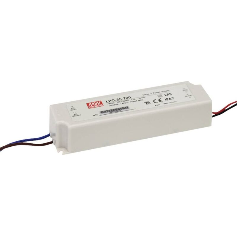 Dettagli tecnici Caratteristiche driver LED non dimmerabile, Protezione sovraccarico Collegamento (Componenti) Cavo con estremità aperte Corrente di uscita max. 0.7 A Dimensione del prodotto, larghezza 42 mm Dimensione del prodotto, lunghezza 148 mm Dimensioni (L x L x A) 148 x 42 x 30 mm Dimensioni prodotto Altezza 30 mm Modello (driver LED) Corrente costante Num. uscite 1 x Numero di ingressi 1 x Peso 340 g Potenza (max.) 33.6 W Tensione di funzionamento 115 V/AC, 230 V/AC Tensione di ingresso (max.) 264 V/AC Tensione di uscita (max.) 48 V/DC Tipo di protezione IP67 Tipo prodotto Driver per LED Uscita alimentazione (min) 9 V/DC Alimentatore switching LED Alimentatore a LED in alloggiamento in plastica con uscita corrente costante (C.C.). Tipo di protezione IP67. Testo tradotto automaticamente. Punti di forza e dettagli Corrente costante 9 - 48 V/DC 0.7 A Caratteristiche Ingresso universale Protezione da sovraccarico mediante limitazione di corrente, auto recovery Protetto da corto