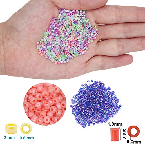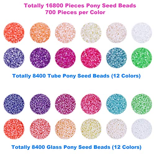 Totalmente 16800 pezzi di perline tubolari e piccole perline includono 24 colori e ogni colore ha 700 pezzi. La confezione contiene anche due corde da 0,5 mm con cordino per bracciale trasparente e 2 fili conduttori per gioielli fai-da-te e creazione di braccialetti.