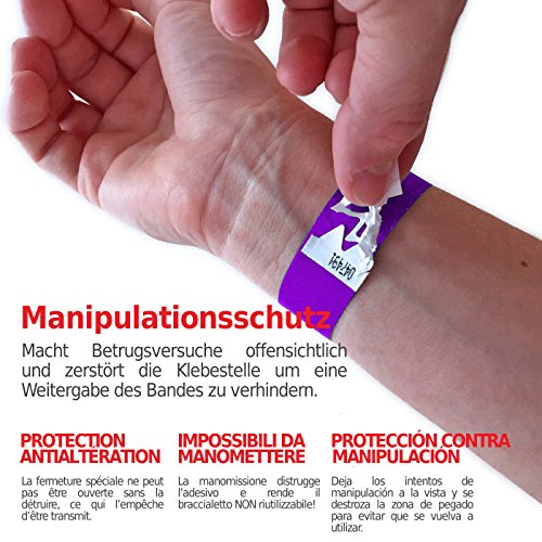 IMPERMEABILI, RESISTENTI A MANOMISSIONI E A STRAPPI - La speciale chiusura non può essere aperta senza essere distrutta e impedisce così un trasferimento. I braccialetti sono fatti di originale DuPont Tyvek e resistono anche a un uso per più giorni in condizioni di bagnato.