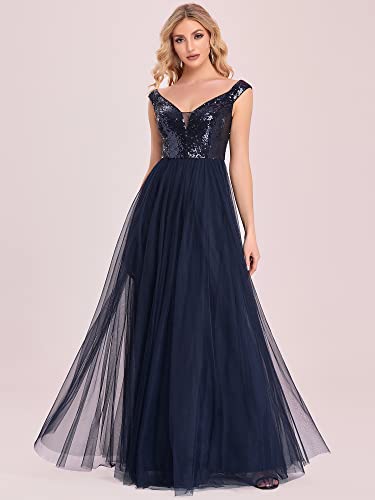 Ever-Pretty Scollo a V delle donne senza maniche Off la spalla Impero Vita Una Linea Piano Lunghezza Tulle Paillettes Prom Abiti da sera EE00277, blu navy, 8