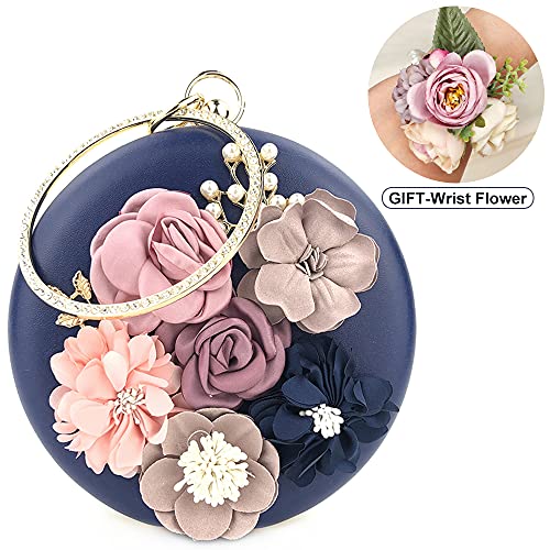 Everfunny Pochette da donna Borse Borse di Forma Rotonda Borsa da sera Fiore Perline Prom Wedding Evening Borsa, blu navy, Medium
